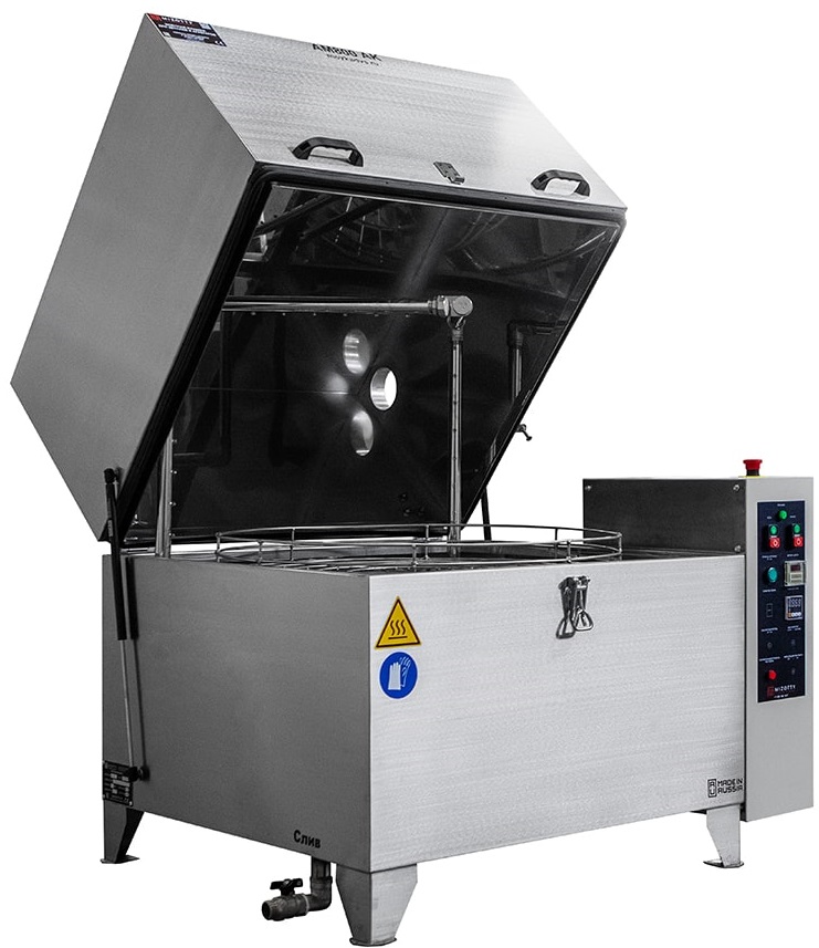 Комплектуется электромеханическим приводом корзины с частотой вращения 5-10 об/мин., обеспечивающим высокое качество очистки, за счет равномерной подачи моющего раствора по всей поверхности деталей.